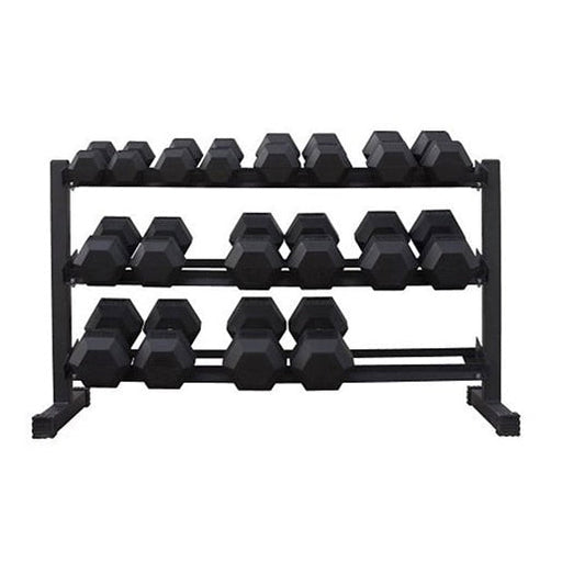 Designed to hold 10 pairs of Rubber Hex Dumbbells on 3 levels. The 3 tier rack is a popular choice where the width needs to be less than on two-ti...