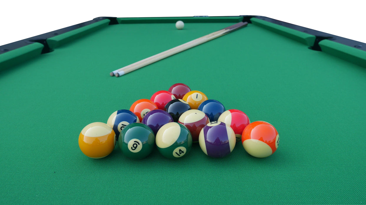 The First Pool table comes complete with four wooden cues measuring at 145cm in length, 1 set of numbered pool balls with a diam. of 57mm, and 1 white ball with a diam. of 54mm. The table is also delivered with 1 Triangle, 1 brush, 6 chalks, 1 plastic cover, and 1 four cue metal holder that fixes onto the side of the table.