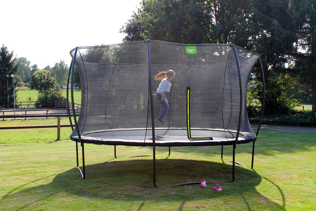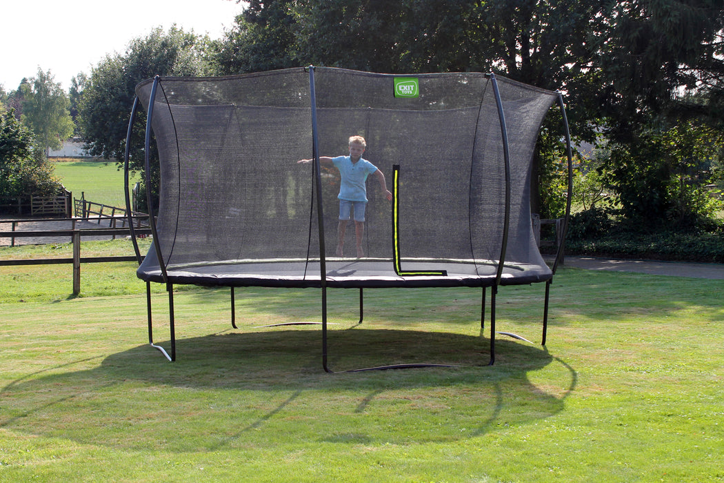 The EXIT Silhouette trampoline on legs is a big round trampoline with a matt black padding. The safety net is standard supplied with the trampoline on feet and it hangs very taut from its curved supports. This is not only very safe because children cannot get tangled in the net, but it also looks much nicer in your garden. The safety net has an eye-catching fluorescent green zipper so that you can see immediately whether the zipper is closed properly.